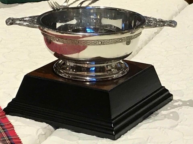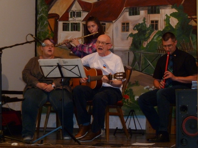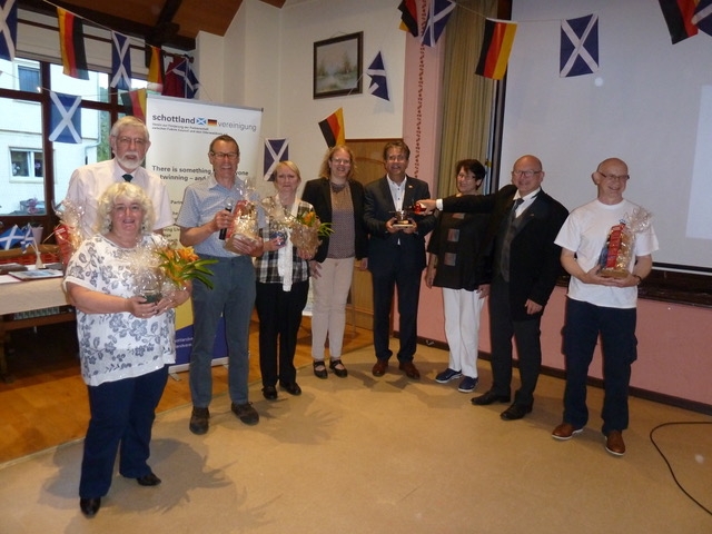 On Saturday, Franziska and Torsten Löw and wee Killian, of course, drove Andy, Myra, Walter and me to Aschaffenburg, while Terry bravely set off on his own by train to Heidelberg. We strolled around the town seeing the Johannisburg Palace, the Pompeiianum, and the Abbey before having lunch at the former Schlappeseppel brewery which is now a museum. There was time for a read on the balcony before getting ready for the SLV’s 40th anniversary celebrations at the Krone in Zell. The aroma of the suckling pig roasting on the spit in the courtyard greeted us as we arrived, as did the sound of the pipes played by Torsten. After speeches by Rüdiger Holschuh, Chair of the SLV, and Frank Matiaske, Landrat, Terry replied on behalf of the OA, and Walter presented Rüdiger with a commemorative quaich and a bottle of whisky. We then enjoyed the buffet with many traditional dishes, and music from Franziska and Torsten Walter, Andy and Terry, and Walter was joined by Jasmin Fritsch and Hanne Stuckert, then by Torsten for a number ot two. The evening finished with all the guests singing ‘Auld Lang Syne’.