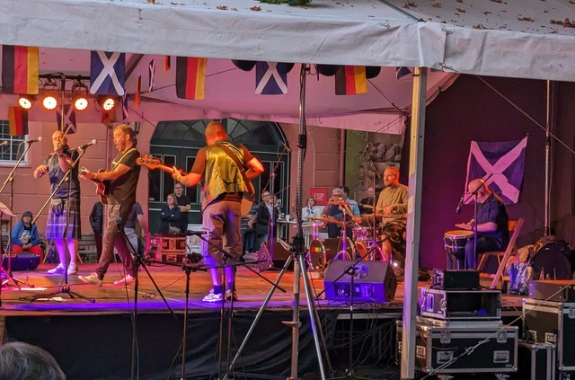 Schottische Nacht took place in the courtyard of Schloss Erbach and local bands The Tonkerers and Glenbervie Folk Duo went across to perform. The evening was a great success, culminating in the Falkirk performers on stage with the Clan Pipers Frankfurt for ‘Auld Lang Syne’.