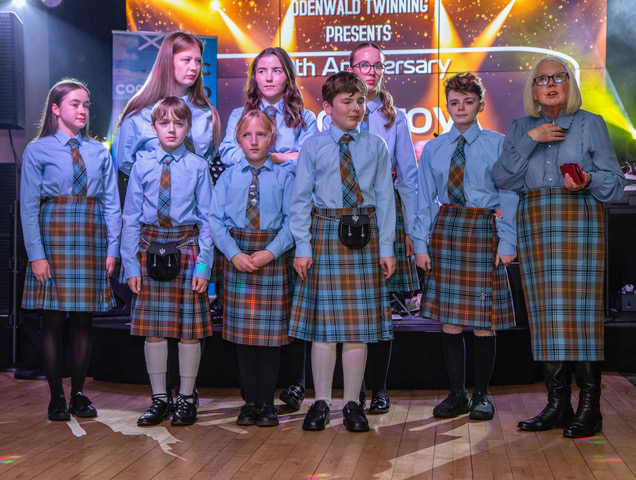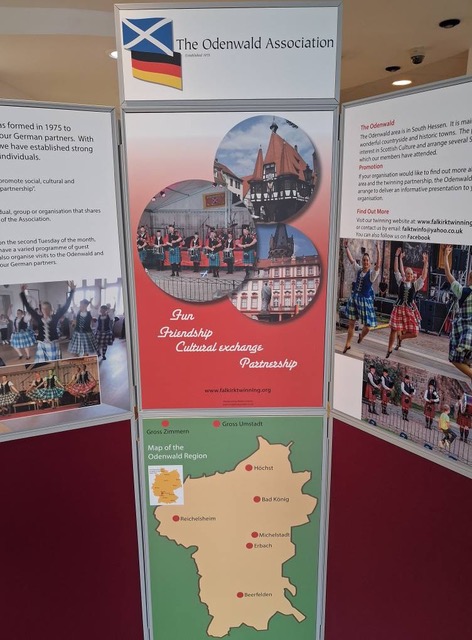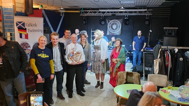 Detlef Kuhn and his partner, Claudia, Martina Emmerich and her family, Franziska and Torsten Löw, and Gudrun Eder came over from the Odenwald for our 50th Anniversary. We celebrated the German Unity Day (Friday, October 3rd) at the Rock Bottom pub in Falkirk with the Tonkerers playing for us, and had an exhibition in the Falkirk Delivers office on the Saturday. Unfortunately, the monthly Producers market had to be cancelled due to high winds so we had to shelve our plans for an Odenwald stall and two other stalls selling German produce, but we all enjoyed the ceilidh in the evening at the Venue in Airth. The Jenkins dancers and the Falkirk Junior Gaelic Choir entertained us before our ceilidh band, Cockleroy, got us all up dancing. Our local MP, Euan Stainbank, attended all three events. Thanks to all who helped in any way with this weekend.