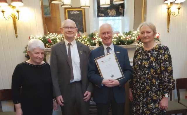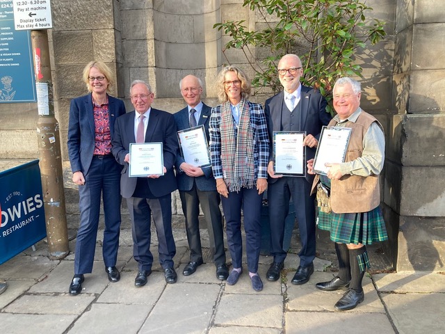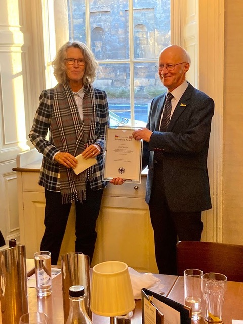 Our Chair, Gray Allan, was pleased and surprised to be presented with the German-British Friendship Award by German Ambassador to the UK, Susanne Baumann at a lunch on Monday, 10th November. This was at Howie’s in Edinburgh, and was hosted by the German Consul General, Christiane Hullmann. As he was allowed to invite three guests, he was accompanied by Isabella, Walter and Anne. In his acceptance speech, Gray pointed out that the Award didn’t just belong to him but was for all the members over the years who have worked hard to keep the twinning link going for fifty years.